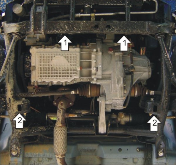 2. Установить заднюю часть Защиты на чашки опор передней подвески при помощи КР 50 А10 М8х30, Гаек 8, Шайб 8 и Гр. Шайб 8.