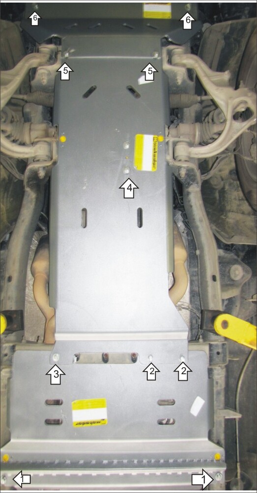 Защищаемые агрегаты: Двигатель, Передний дифференциал, Коробка переключения передач, Радиатор, Раздаточная коробка\n