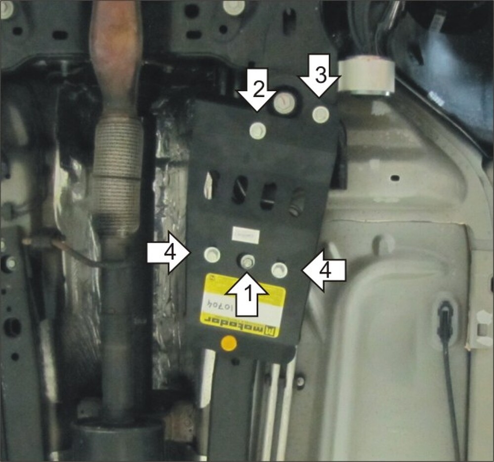 2. Установить на отверстие чашки подрамника правую переднюю точку защиты при помощи ПР 70х20х6 А15 М10, Болта М10х20, Шайбы 10 и Гровера 10.