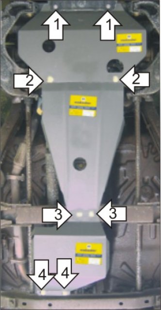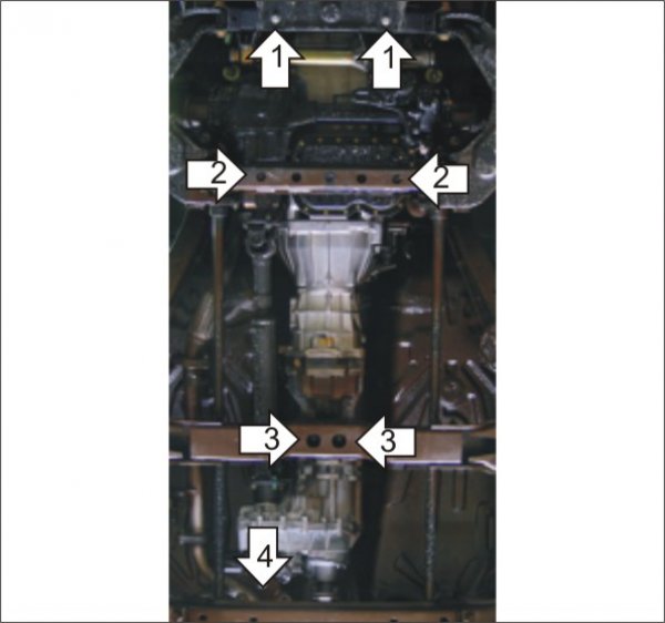 1. Установить на поперечную балку передние точки крепления первого щита Защиты при помощи штатного крепления.