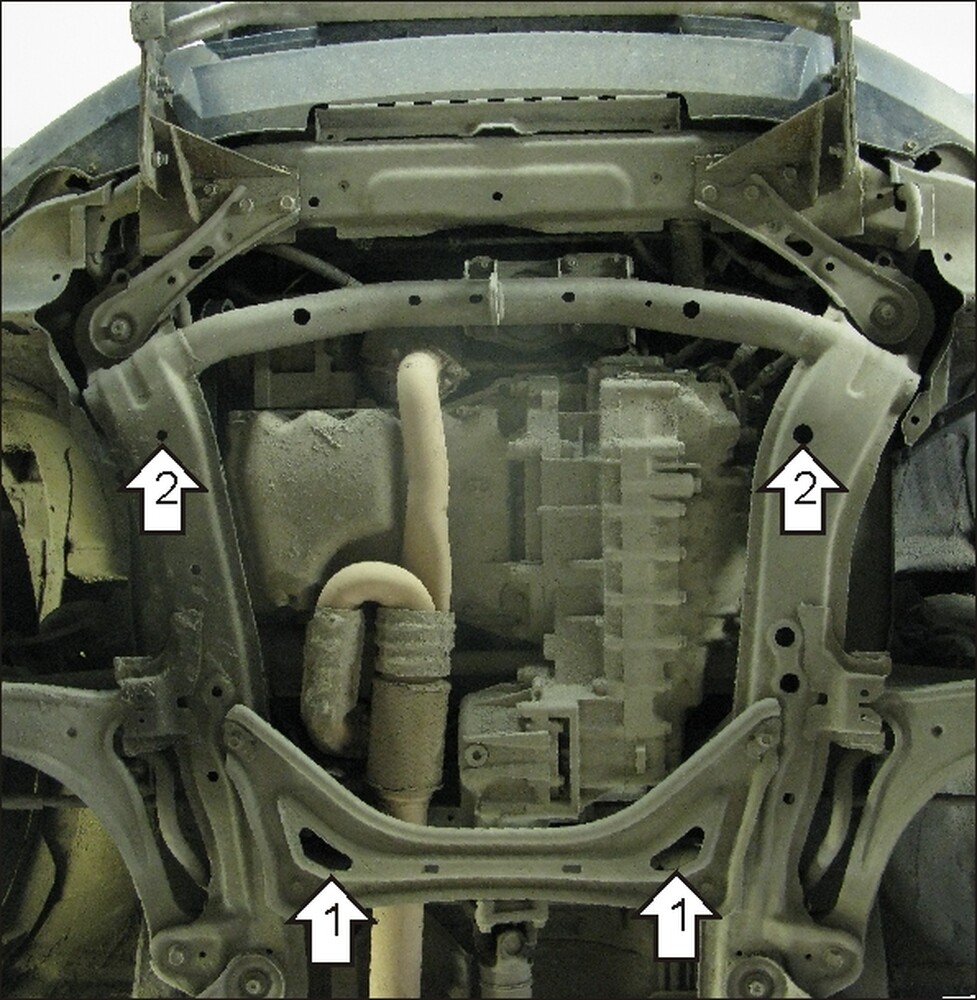 1.В отверстиях подрамника передней подвески разместить ПР 80х20х6 М10 и наживить Болты М10х30 с Шайбами и Гроверами 10. Завести задние точки защиты.