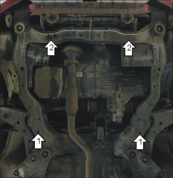1.Установить соосно с отверстиями в подрамнике передней подвески ПЗ 61х20х6 А40 М10 и наживить Болты М10х90 с Шайбами и Гр. Шайбами 10. Завести задние точки крепления защиты.\n