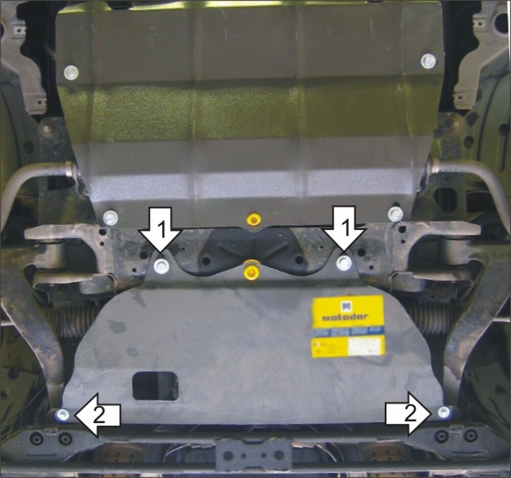 2. Установить на подрамник в задней части моторного отсека задние точки крепления Защиты при помощи Болтов М6х30, Шайб 8, Шайб 6 и Гроверов 6.