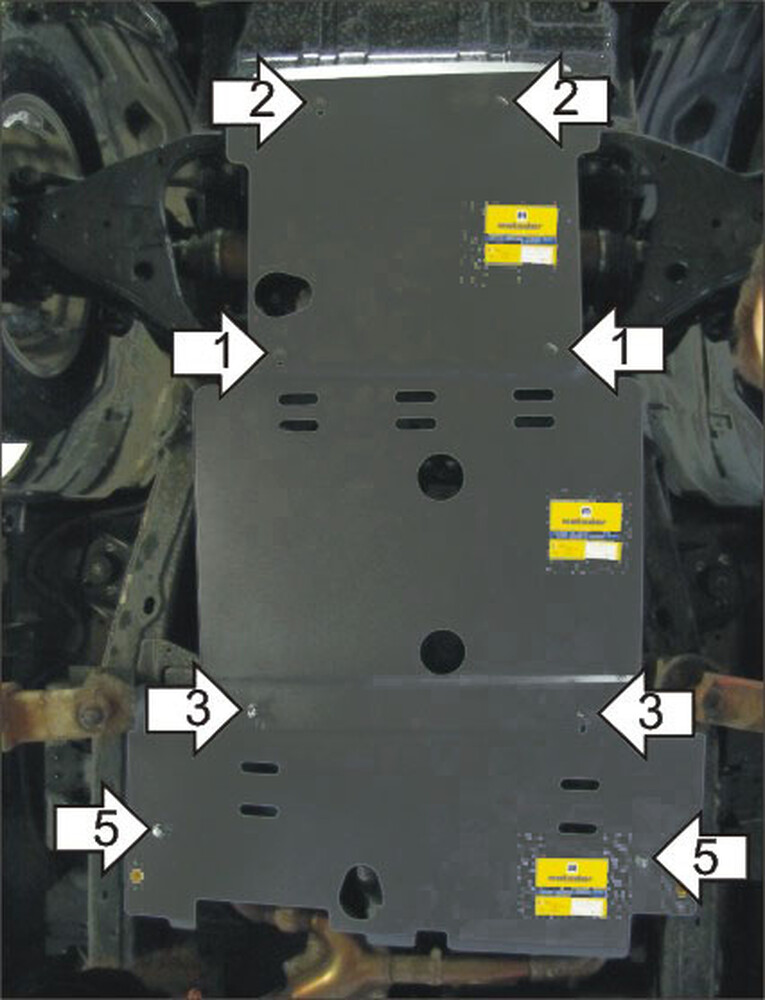 1. Установить на поперечную балку передней подвески задние точки крепления первого Щита и передние точки крепления второго Щита Защиты при помощи ПР 50х20 М10, Болтов М10х60, Шайб 10 и Гроверов 10.\n