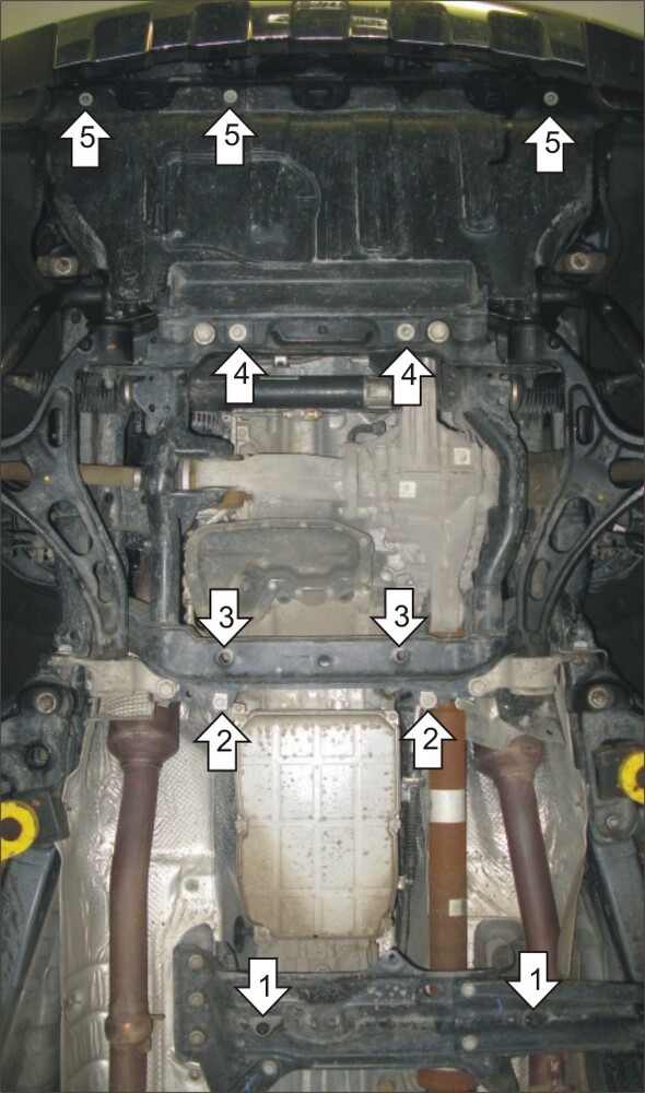 2. Отвернуть штатные болты на задней поперечине подвески и прикрепить ими передние точки Щита 3.\n